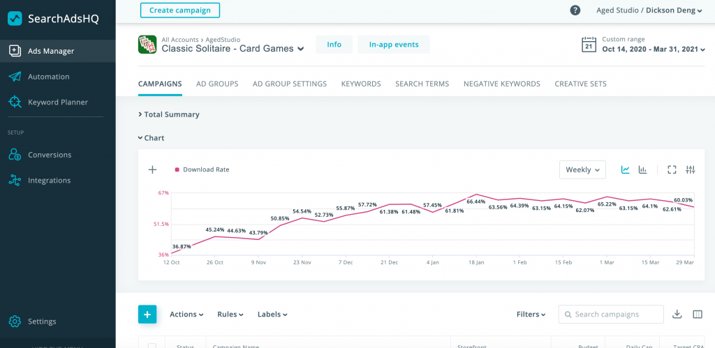 Our automated rules also played a big role in taking the app marketing for Aged Studio to the next level. Their team created 40 automated rules with SplitMetrics Acquire to optimize keywords and bids. This feature not only helped with meeting and exceeding KPIs, but greatly saved time on managing ad campaigns as well.