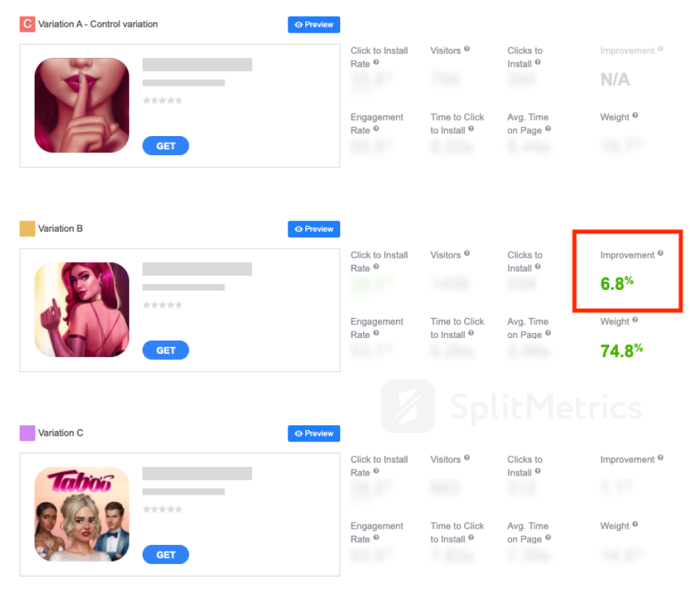 With the suggestion of the SplitMetrics team, Nanobit created new variations of the Tabou Stories: Love Episodes icon, and one of them immediately outperformed the control variation.