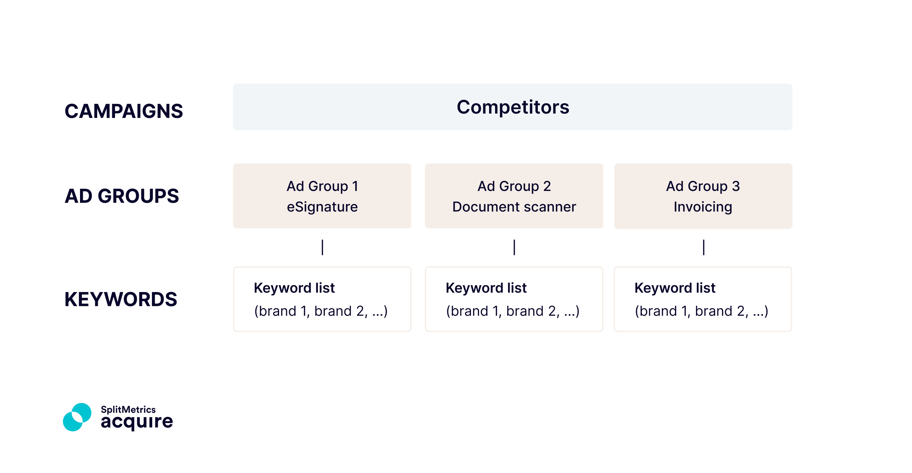 From a practical perspective, an account structure in Apple Ads is created and maintained by configuring and categorizing ads, ad groups, and campaigns using the designated options available in Apple Ads and, by extension, SplitMetrics Acquire.