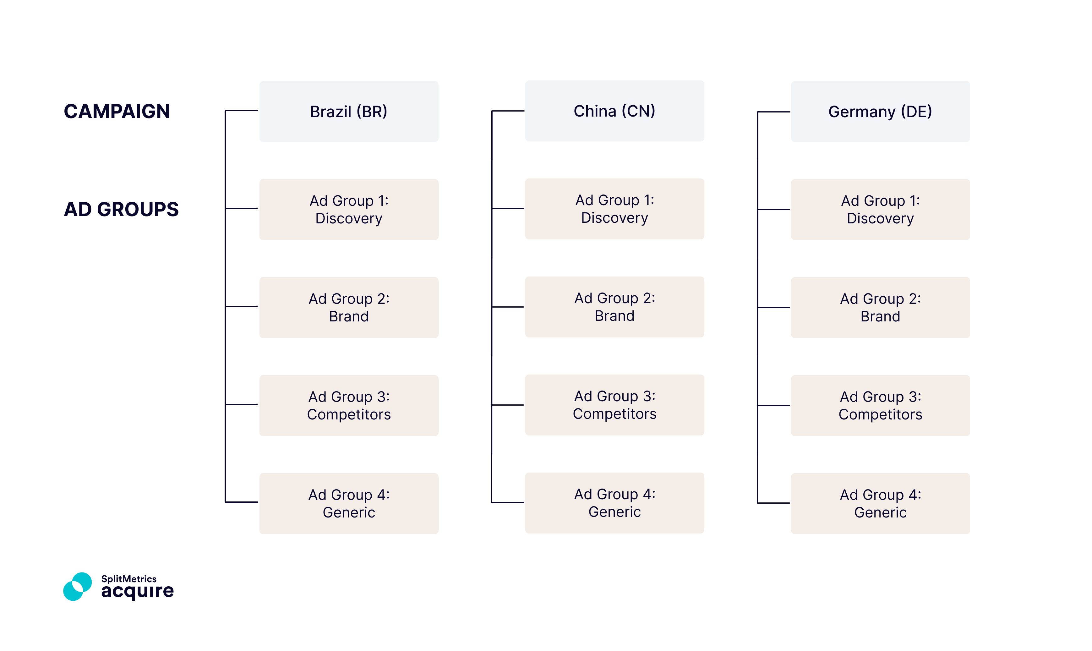 Key markets can also be contained within a single campaign, with multiple ad groups covering discovery, brand, competitors, and generic campaigns. Others can be grouped in a single campaign when they share similar attributes, like value or language.