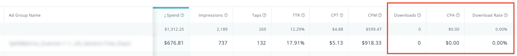 Since there are no Downloads data in Apple Ads reports (as at the pre-order stage it’s impossible to download the app), nor can we see on the SplitMetrics Acquire dashboard how many users pre-ordered the app, this kind of information can only be obtained from pre-order reports in App Store Connect. Thus, for this type of campaigns only the following metrics are available: Spend, Impressions, Taps, TTR, avg. CPT, avg. CPM.