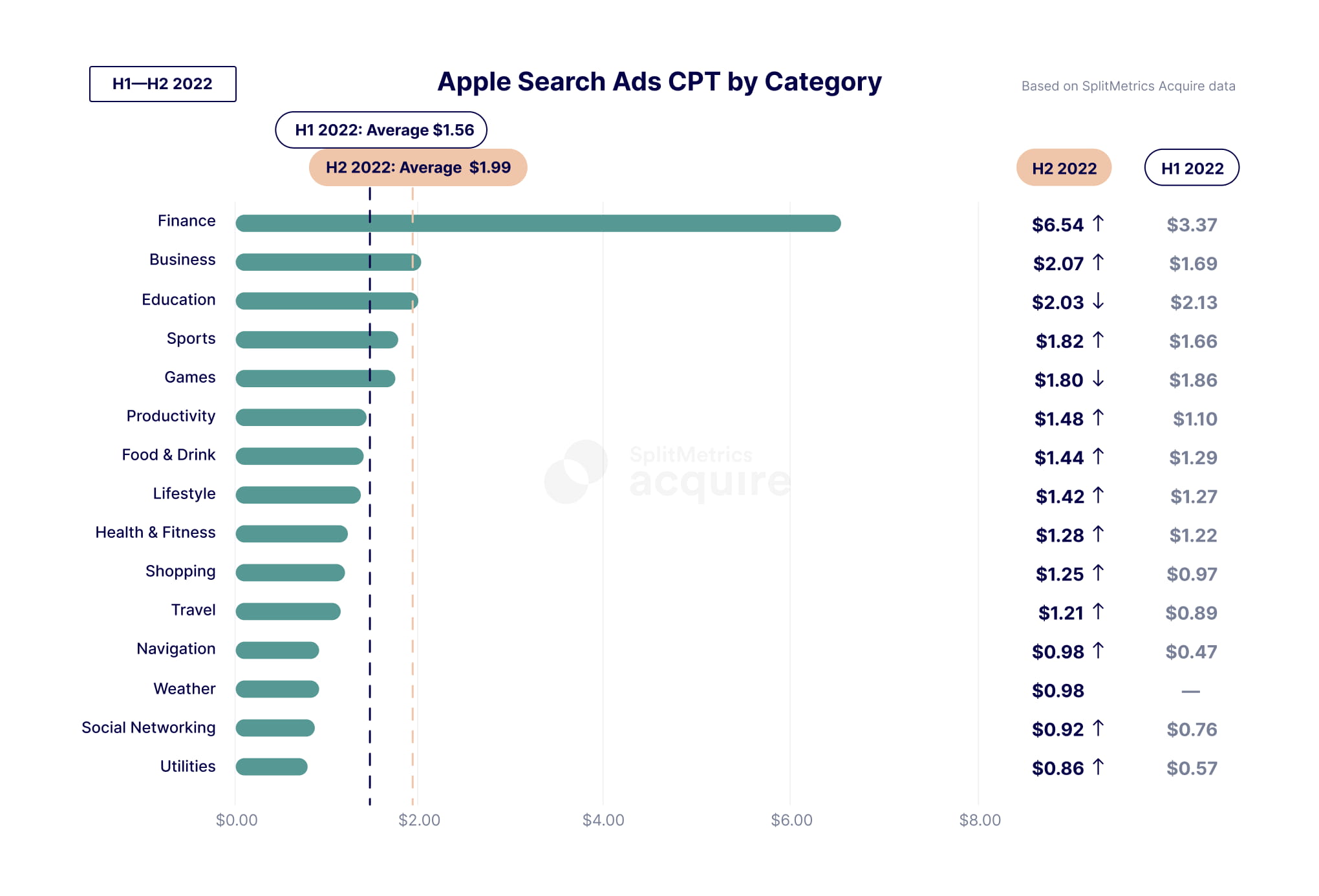 The increasing competition dictates its own rules, so you can already see CPT and CPA growing. This is something we at SplitMetrics have observed too when collecting data for our recent Apple Ads Search Results Benchmarks Report.