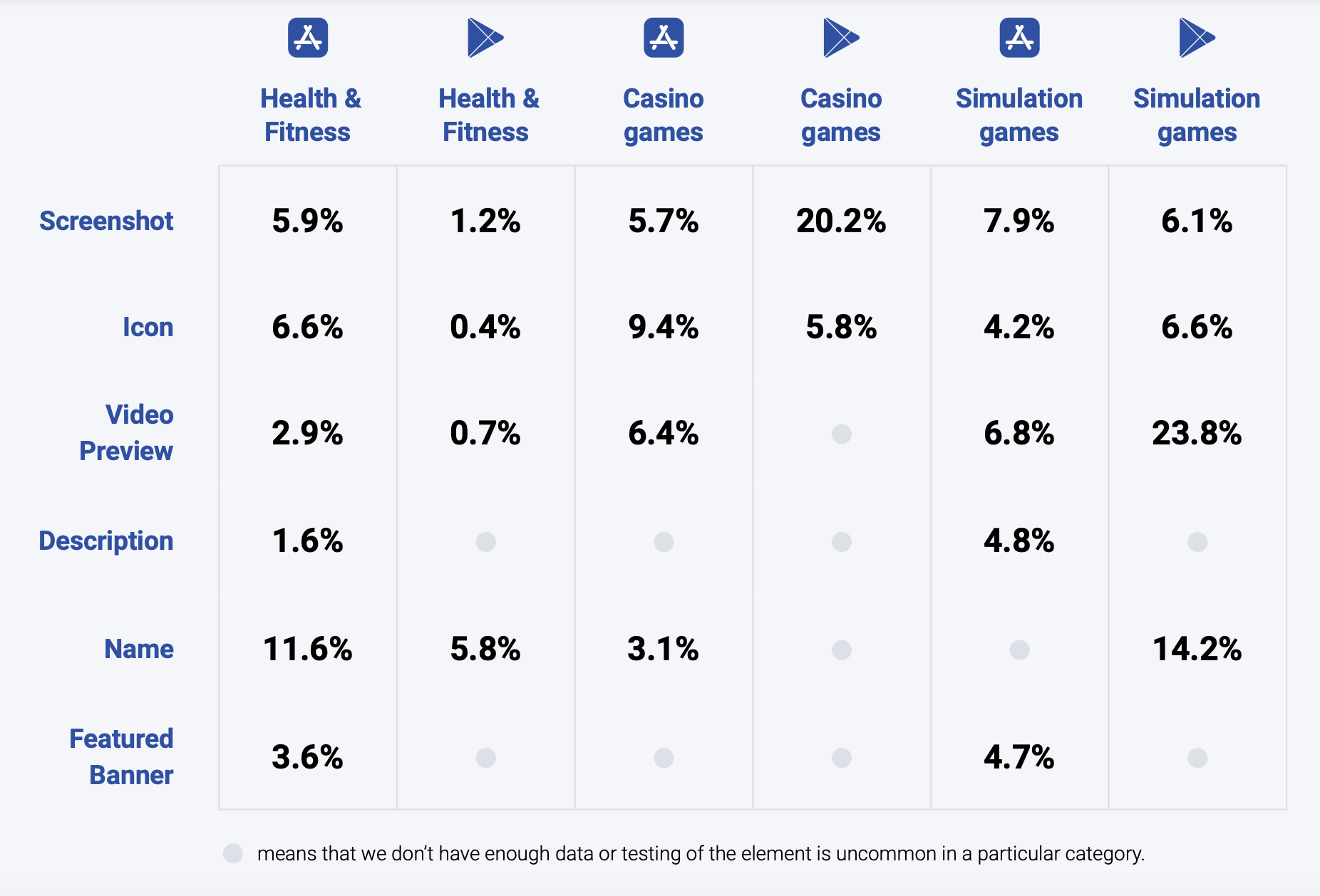 As you can see, screenshots are crucial for Casino games on Google Play, while for Simulation games, video preview is the determining factor when players decide whether to download a game or not. Health & Fitness apps, surprisingly, attract users more with their name than with the visuals.