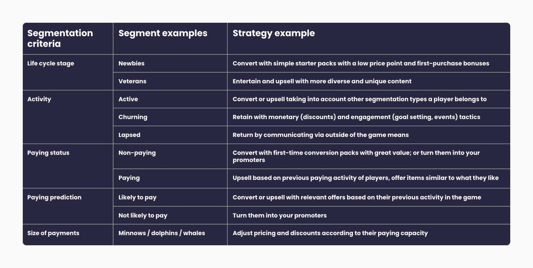 To increase your game’s LTV, you need to treat each user differently. Of course, it doesn’t make sense to target each user and create millions of unique events and offers. That’s where segmentation comes in handy. It’s easier to group users into segments based on criteria and then target these segments.