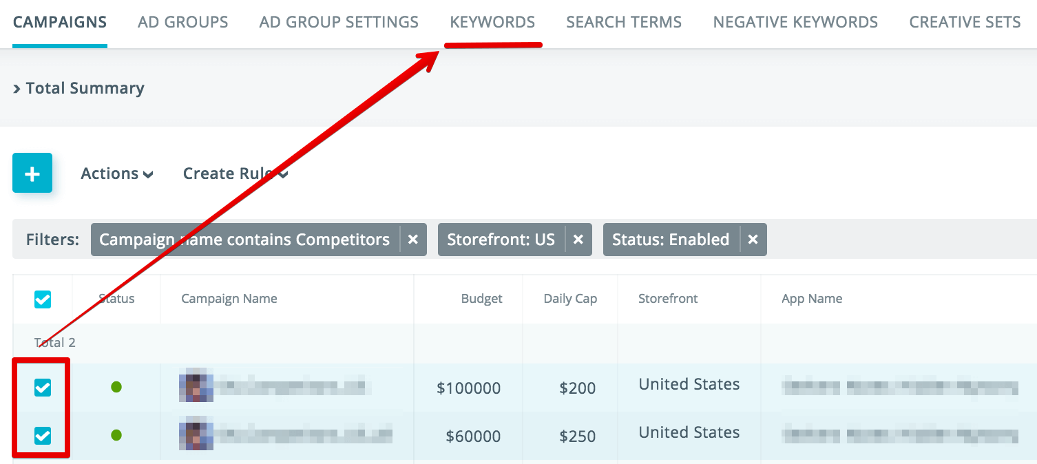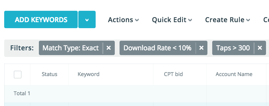 The system will automatically apply the filter and show all the keywords for the selected campaigns. It doesn’t matter which account or app these campaigns are associated with.