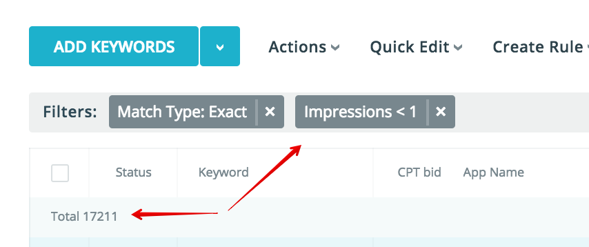 2. Use the filter to count keywords with few (e.g. from 0 to 5) or no impressions (e.g. 17,211):