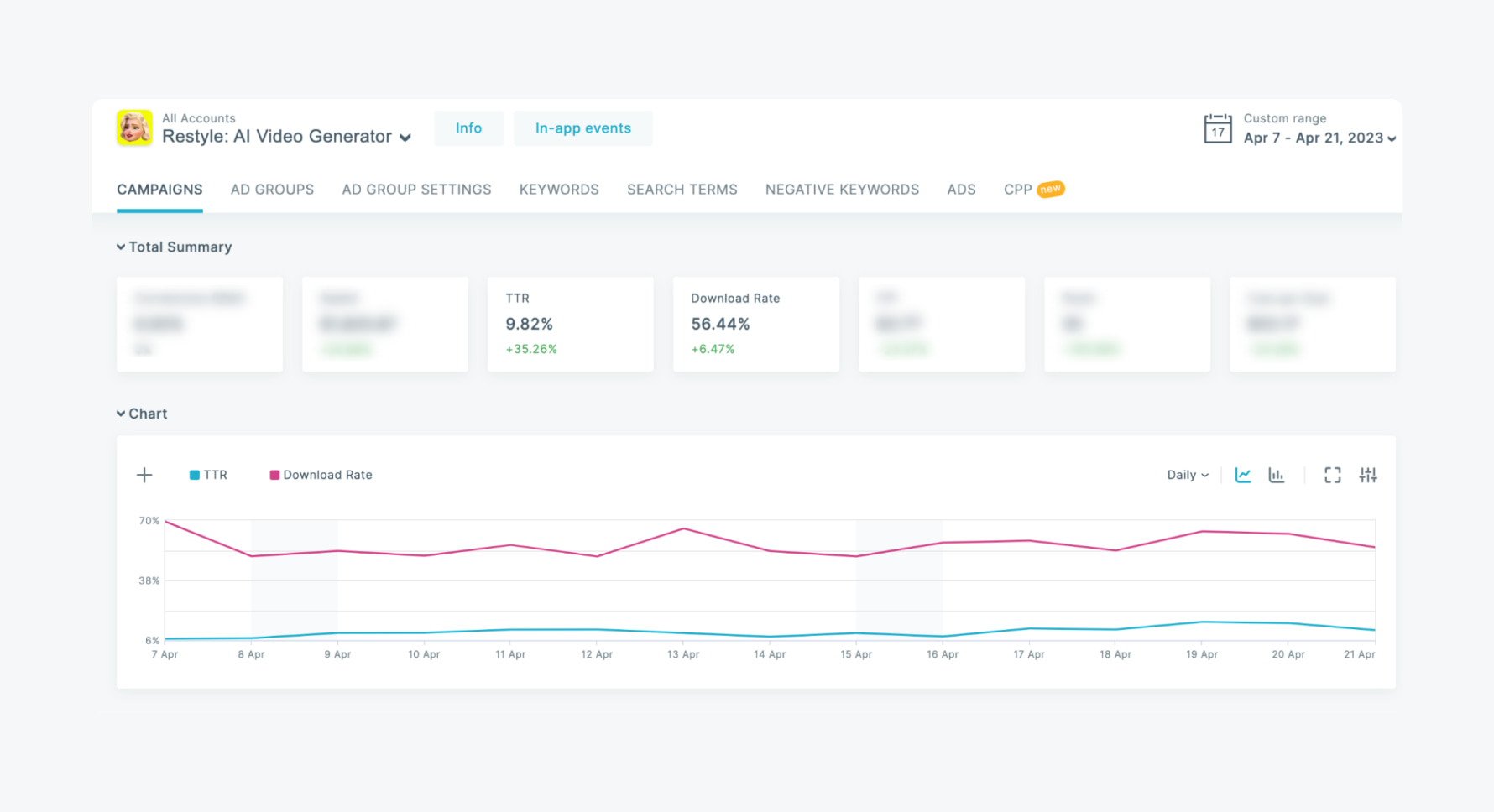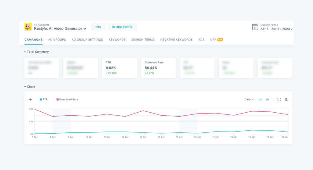 As CR and TTR are traditionally high on Apple Ads, the Client tapped into the channel to acquire strongly motivated users. The Client was looking for a way to enhance Apple Ads’ native interface and manage their campaigns more effectively with a third-party solution — and, therefore, get CR and TTR uplifts.