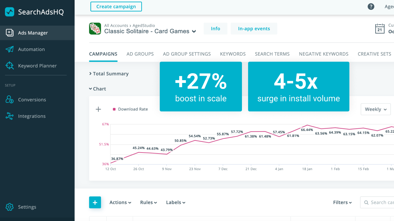 That’s why SearchAdsHQ is a great tool to enter a new Apple Ads market. You’ll be able to quickly adjust your account structure, smoothly automate your campaign management, and see early results as soon as possible.