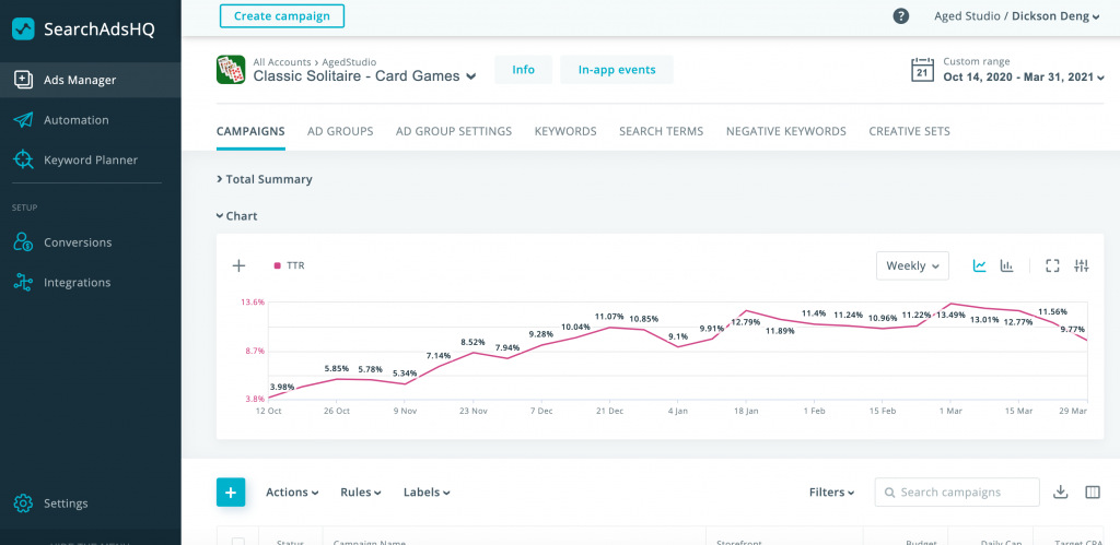 The Aged Studio team started using SplitMetrics Acquire in November 2020. With about 30 target markets, mostly European countries, they focused on building a campaign structure focused by keyword themes, expanding and optimizing keywords, and tracking KPIs that included CPA, TTR and CR.