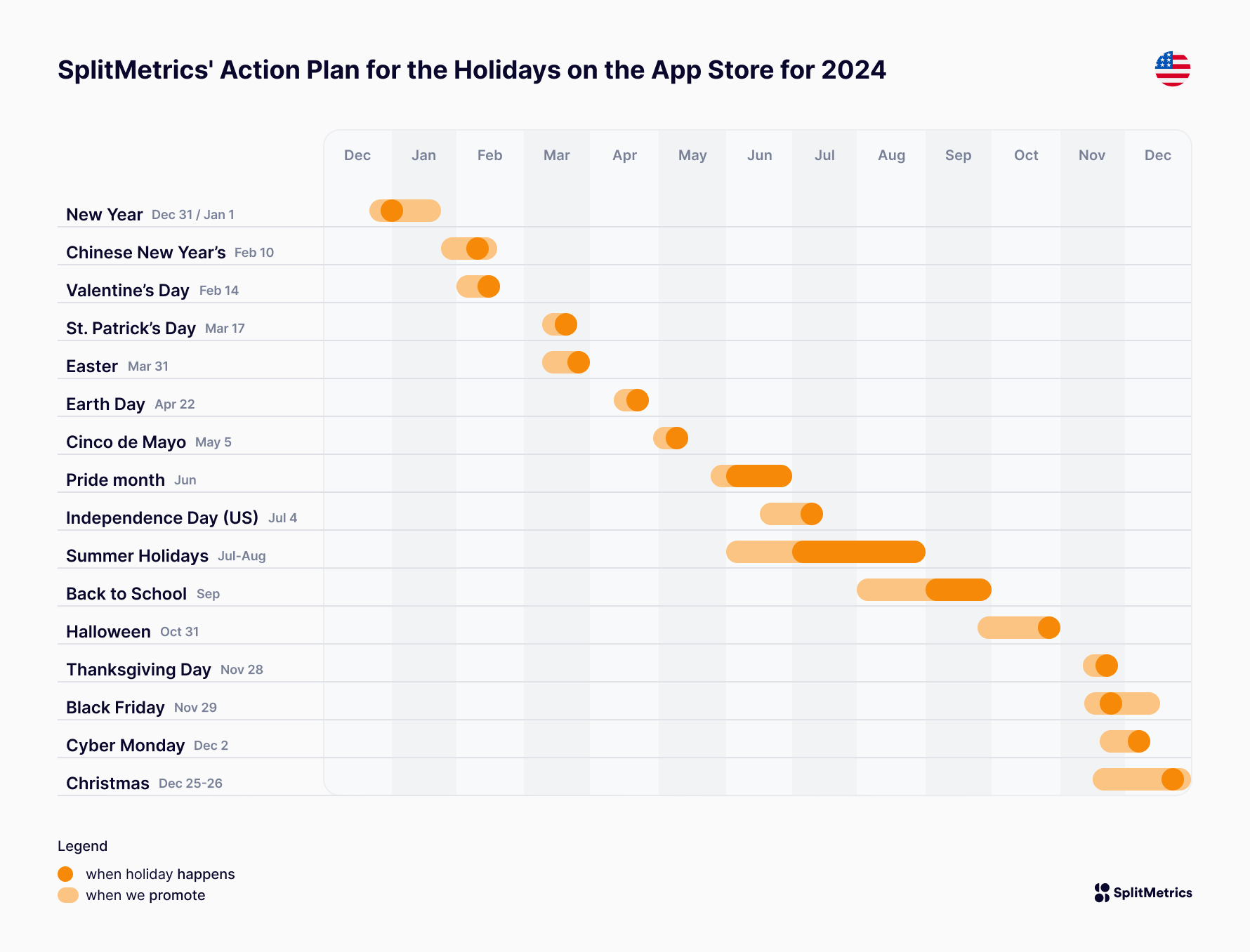 This article continues our Ultimate Seasonality Guide for Creative Optimization on the App Store #1 , where we showcased holidays and festive days popular in the USA and taking place during the fall & winter. We highly recommend reading it, as it contains a wealth of tips & insights useful for all ASO & Apple Ads activities related to holiday campaigns.In this continuation, we give a comprehensive overview of holidays & festive periods in the USA in spring & summer.