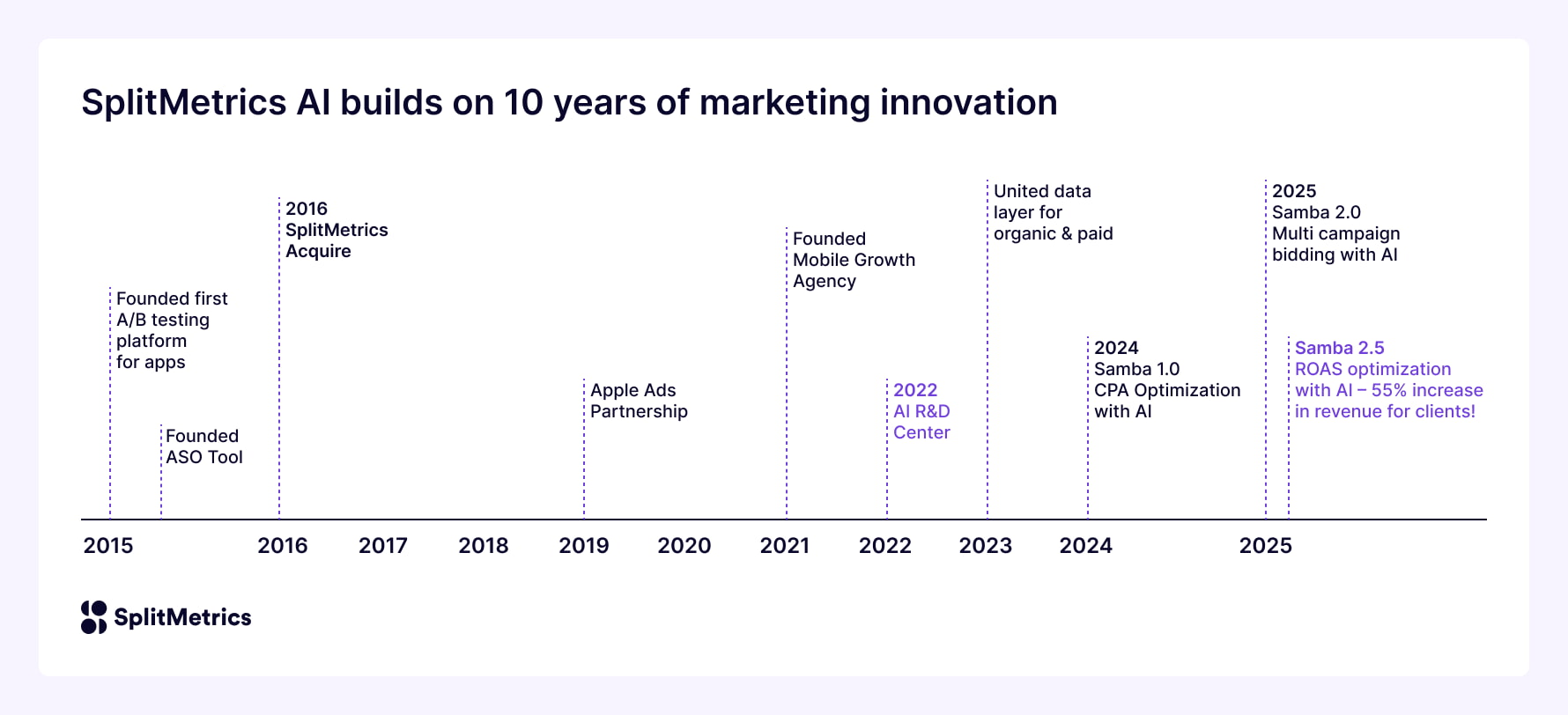 Samba is built on a decade of marketing innovation, primarily in Apple Ads automation. SplitMetrics Acquire, our platform for managing and optimizing Apple Ads, was launched the same year as the advertising platform (then known as Apple Search Ads).