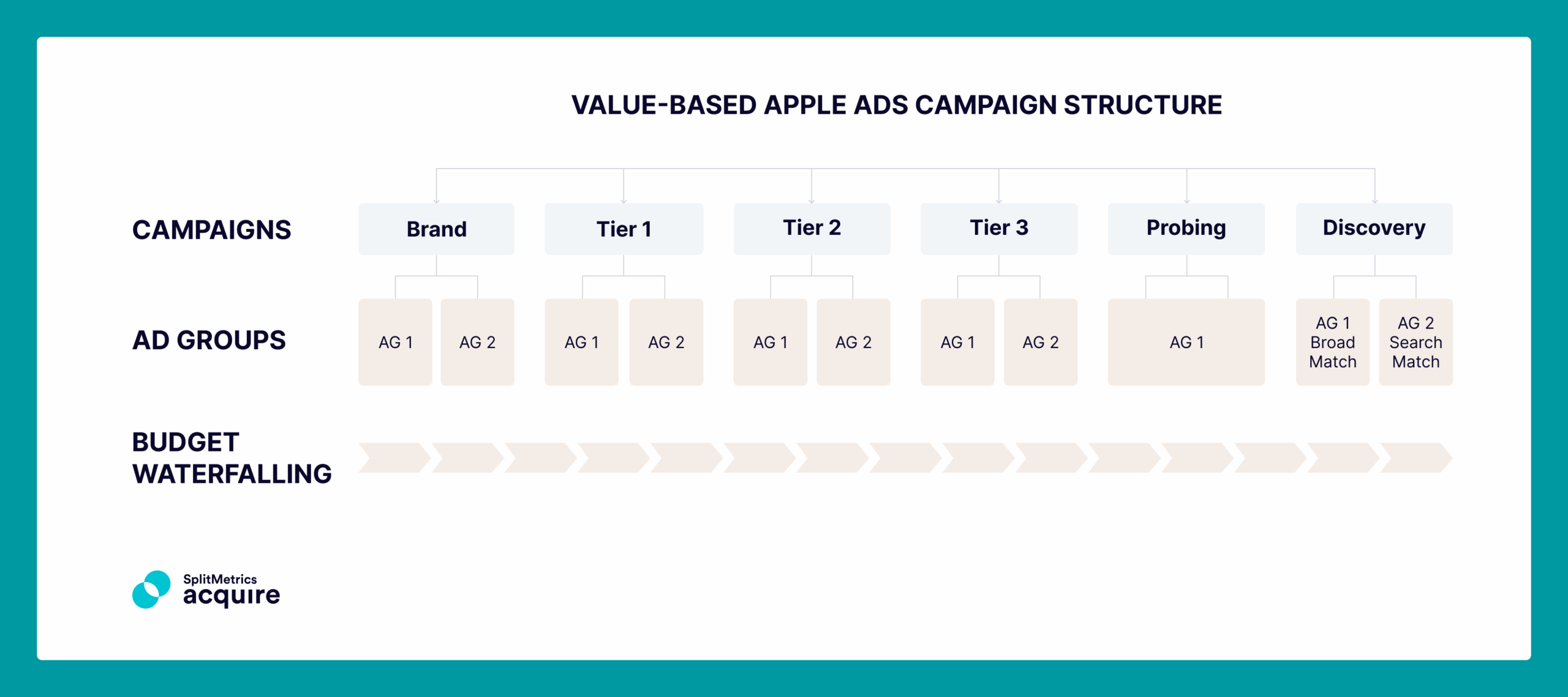 An example of a value-based Apple Ads campaign structure for search results ads.