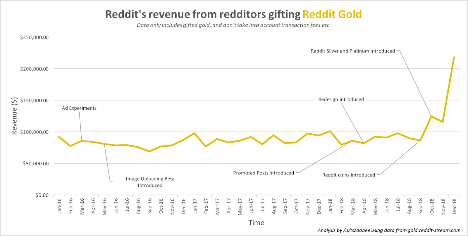 Consumable purchases have a simple concept behind: the app offers goods that can be purchased several times and have limited use before a customer will need to buy them again. A great example of that is Reddit social media platform coins. They resemble real-life currency and can be used to award other Reddit users. The currency helps sustain the platform while letting people highlight their favorite posts with awards, adding sentimental value to the experience, which in turn boosts user retention. Receiving Gold or Platinum awards on Reddit gives the post creator coins as a reward for their effort, and it serves to encourage people to create more relevant, high-quality content. The graph below shows Reddit’s monthly revenue before and after Reddit coins were introduced, creating statistics based on the number of Reddit Gold awards being gifted by users. As seen from the graph, the numbers skyrocketed after the introduction of that feature.