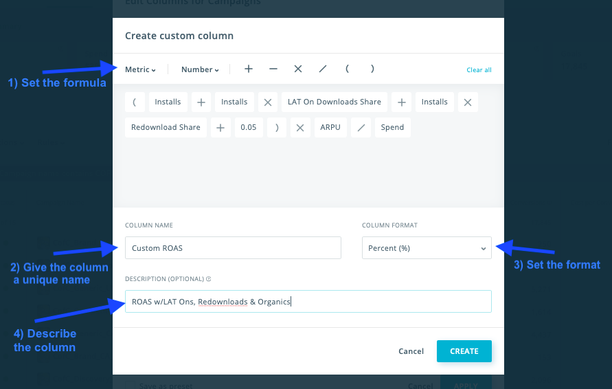3) the column format – value ($), percent (%) or number (1, 2, 3), depending on the metric type. For example, set percent for a custom ROAS column or value for custom Cost per Goal.