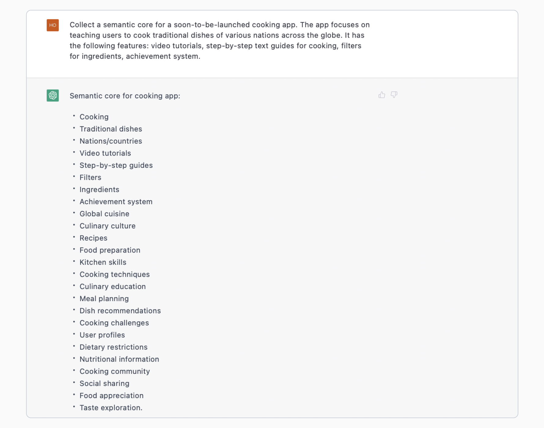 AI tools are revolutionizing mobile development and marketing, with a variety of solutions already available in the market. ChatGPT, for example, offers a range of benefits, including brainstorming features, as well as assisting with asset creation, coding, metadata optimization, semantic core collection, etc. Here’s an example how we at SplitMetrics got a semantic core for a non-existing app from the chatbot: