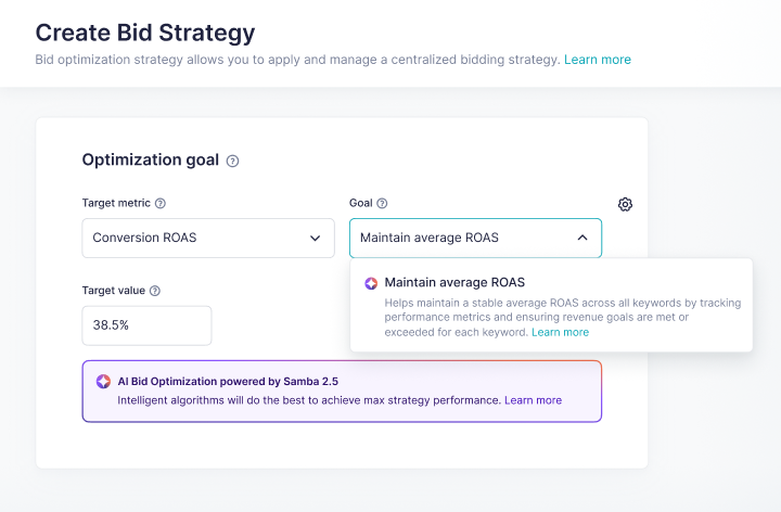 Samba is our first set of AI models for marketing performance optimization. It can understand and perform bidding tasks involving thousands of keywords and campaigns. Explore its capabilities and see how it can elevate your workflows when you're ready to integrate AI.