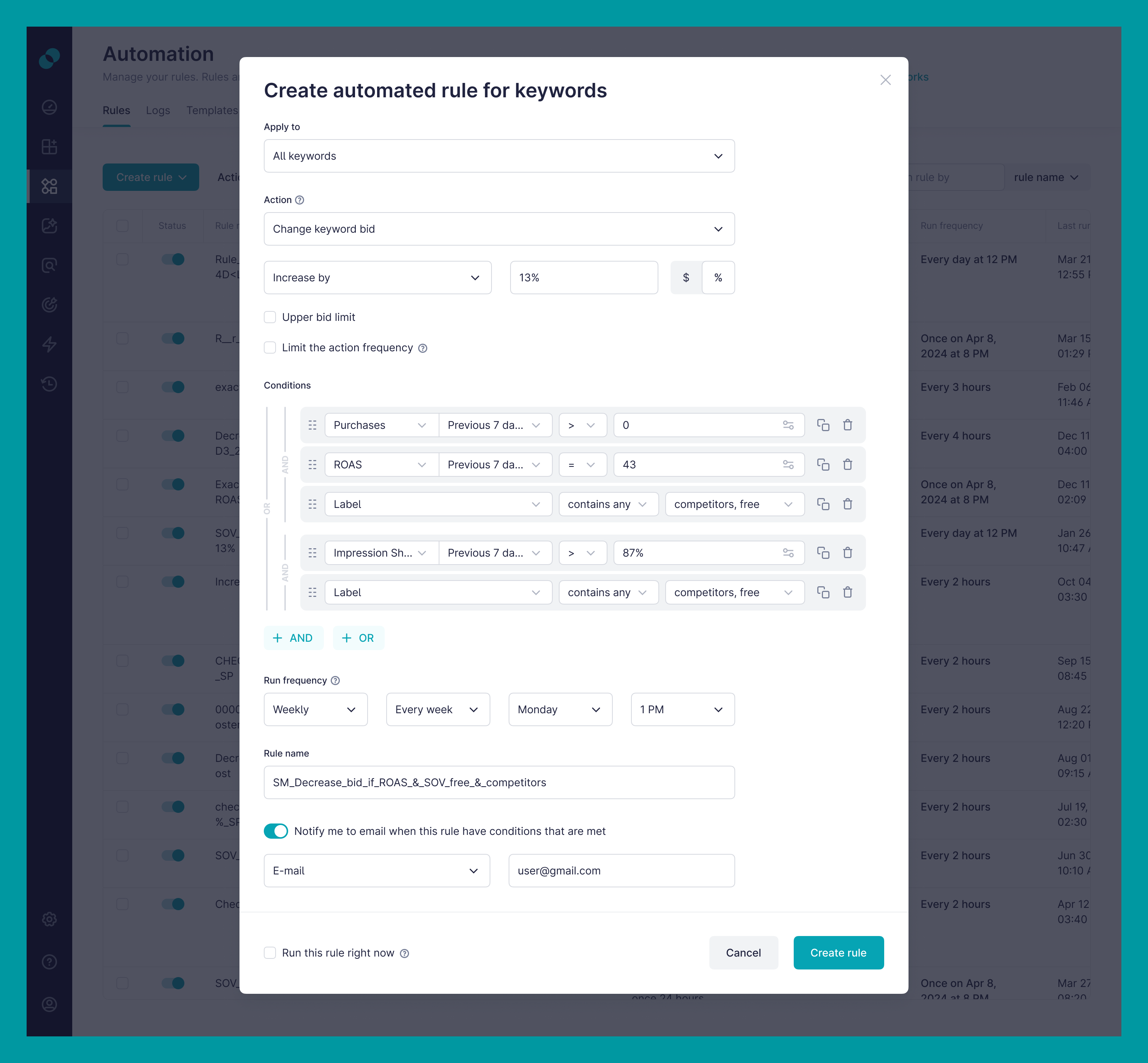 • You can tailor rules to fit your specific goals, from budget management to keyword performance.