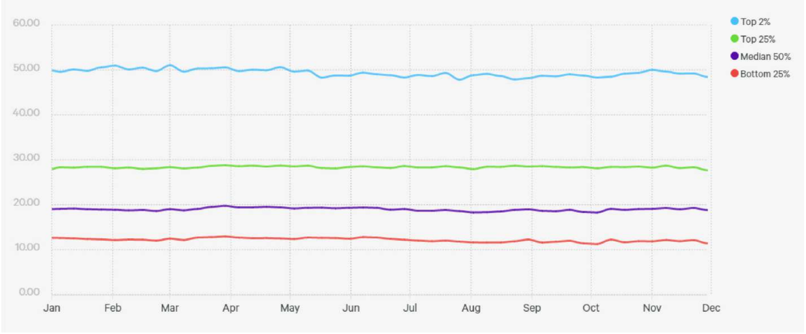 On the graph you can see that for the top 2% of simulation games, day 1 retention was between 47.81% in July and 51.06% in March. For the top 25% of simulation games, day 1 retention was even in November (27.66%) and in March (28.79%).