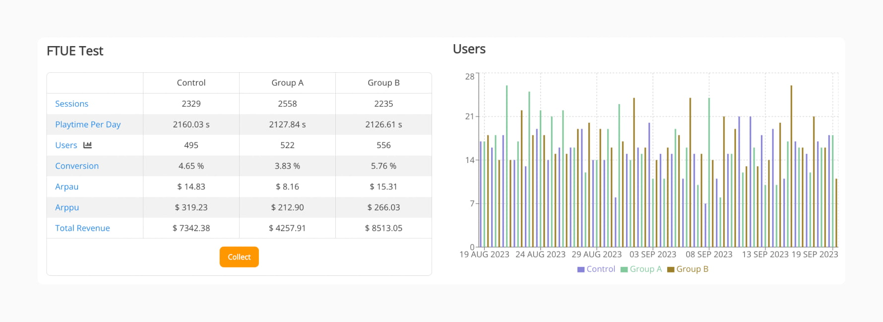 In addition to analyzing the results of special offers and events, analytics is critical in conducting A/B testing. By analyzing the data generated during A/B testing, developers can decide which version to release to players to grow target metrics. According to many developers, A/B test correct analytics is actually the most challenging and time-consuming part of LiveOps.