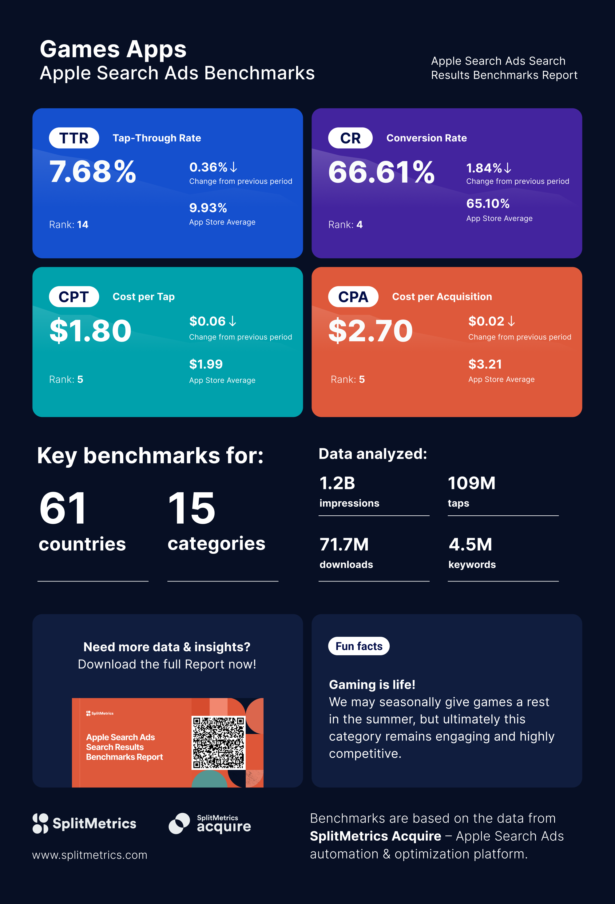 For more information about the mobile gaming market state in terms of Apple Ads campaigns, download the latest Apple Ads Benchmarks Report created by our team.