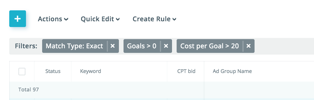 Filter out the keywords with at least one Goal and CPG > Target CPG. For example, if your Target CPG = $20, set CPG > $20.
