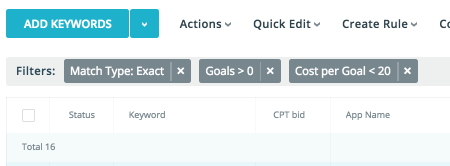 The system will automatically apply the filter and show all the keywords for the selected campaigns. It doesn’t matter which account or app these campaigns are associated with.