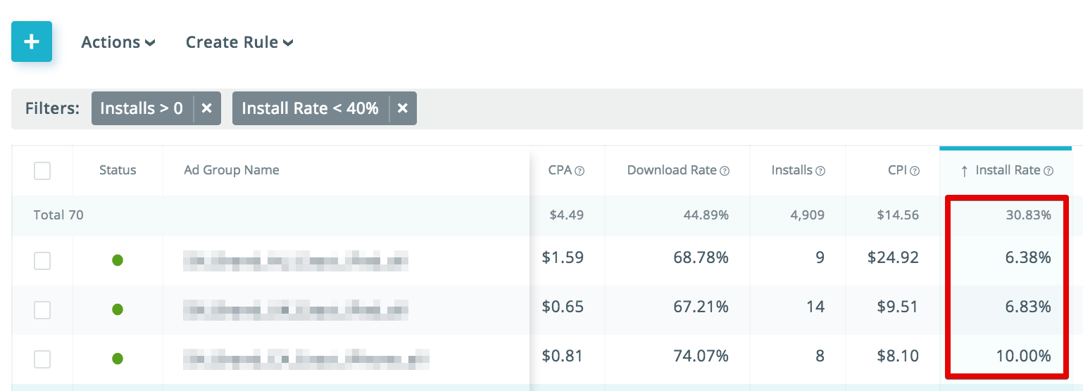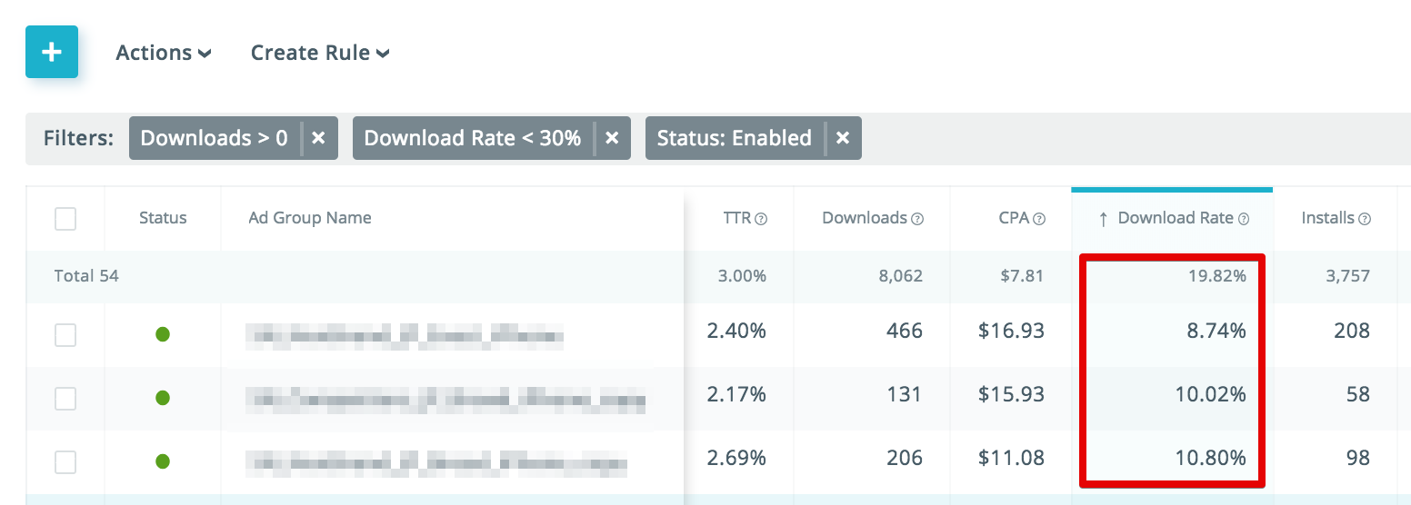 Similar to the filter above, groups with low Download Rates show the areas that require optimization. According to Apple, the average Download Rate is 50%. The example above includes a more conservative rate of 30%.