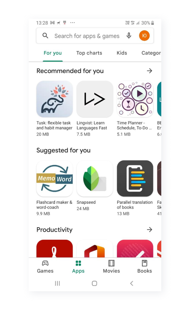 When a user enters Google Play, the first thing they see is apps that are suggested based on applications they searched for and installed before.