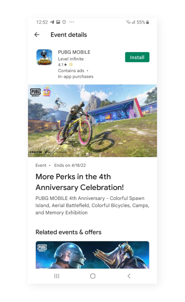 2. LiveOps in Google Play helps you inform users about a limited-time offer or event that’s happening in your app or game. LiveOps cards consist of the title, picture, and description. With them, you can notify users about offers, events, big updates, collaborations with other companies, and announcements for users who were previously registered in your app. These cards motivate users to download the app and make a purchase. Users can see them on the app page, in the search results, and in the apps and games section.