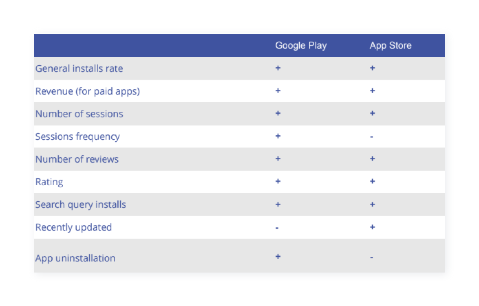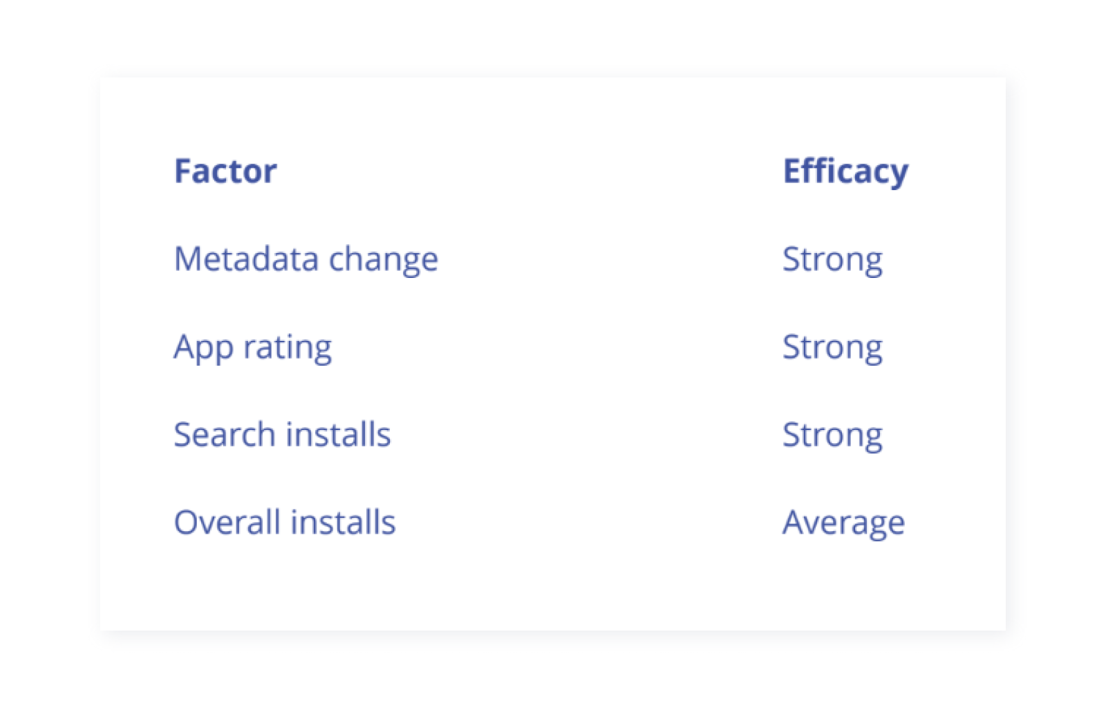 We analyzed what factors influence app rankings and made a table based on our findings. Let’s look at how all these factors influence app positions.