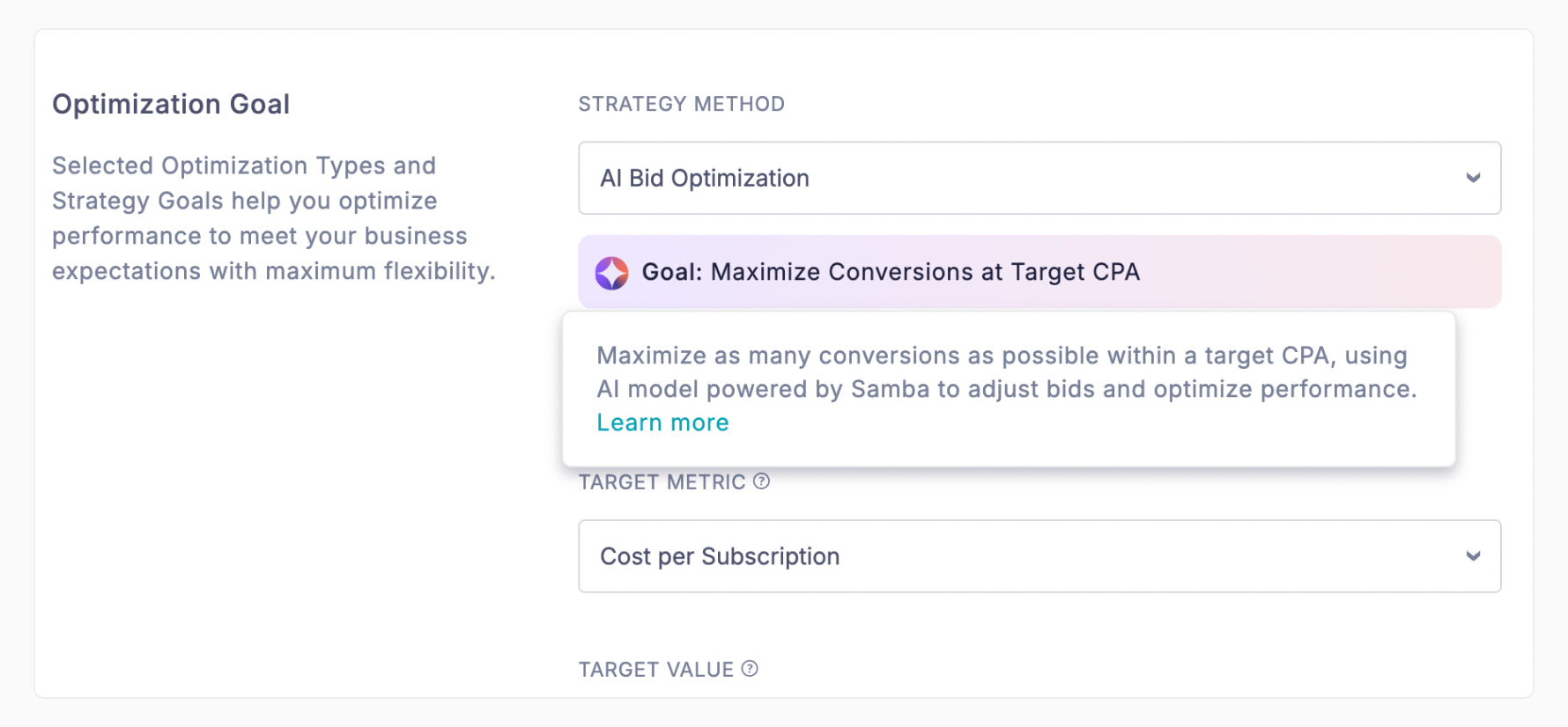 AI Bid Optimization is designed to maximize conversions while maintaining your target cost-per-action (CPA), all without manual adjustments. Powered by SplitMetrics AI, this feature follows a goal-oriented strategy that automates bid management at the campaign level.