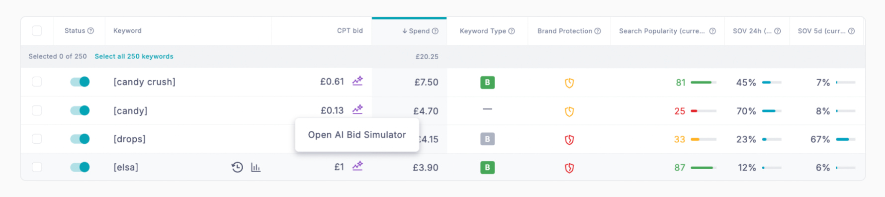 Discover how your keywords will perform at different bid values. Based on historical data and simulations, the AI Bid Simulator forecasts daily performance for each bid, detailing potential spend, conversion volume, and CPA. This comprehensive analysis provides clarity on how adjustments will influence key campaign metrics.