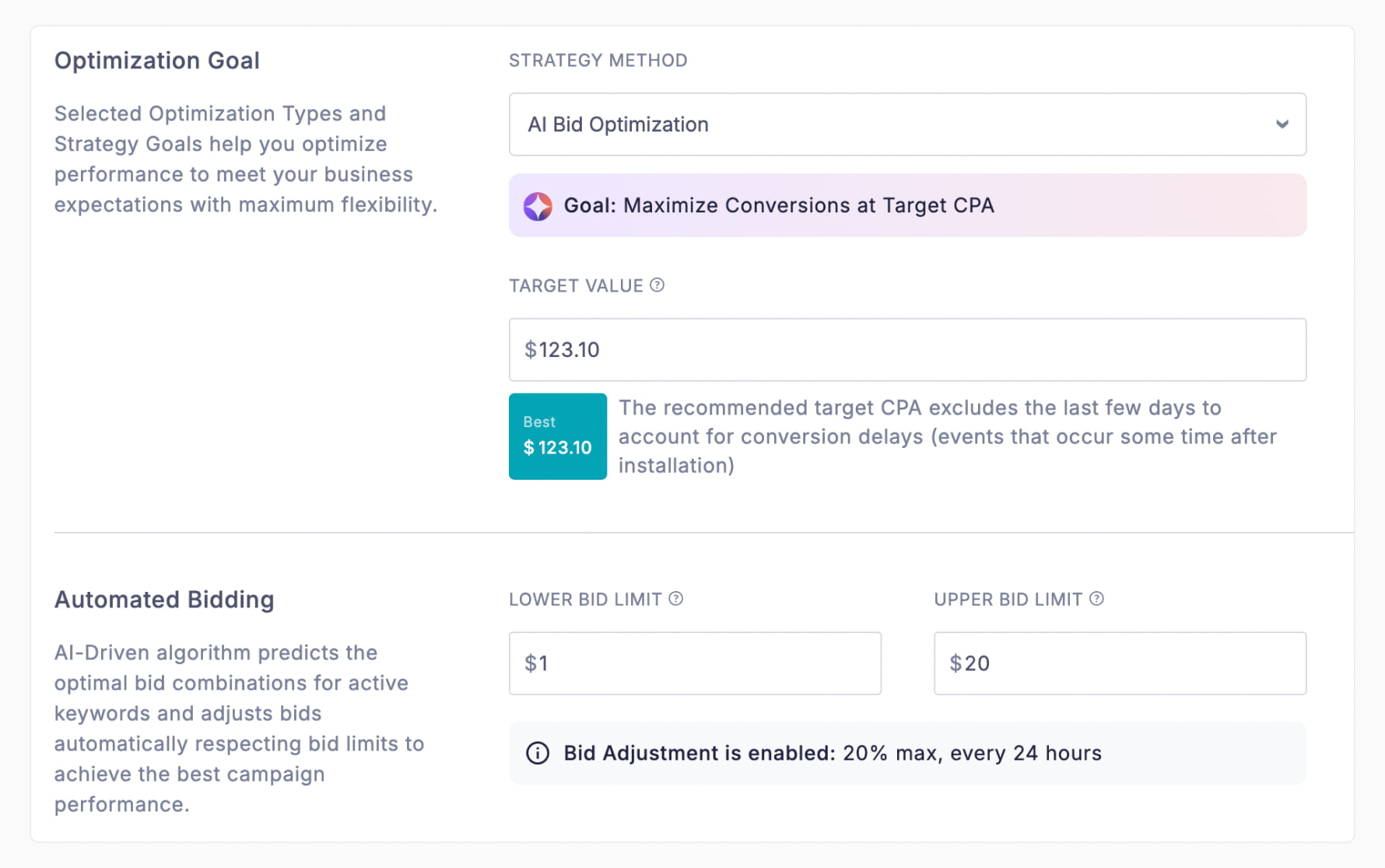 • Real-Time Adjustments: The AI continuously recalibrates bids, ensuring alignment with your CPA goals.