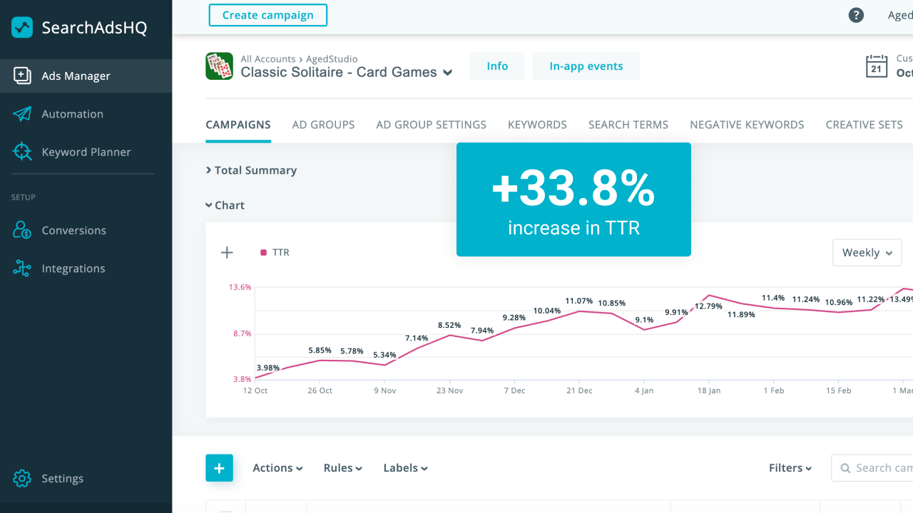 That’s why SearchAdsHQ is a great tool to enter a new Apple Ads market. You’ll be able to quickly adjust your account structure, smoothly automate your campaign management, and see early results as soon as possible.